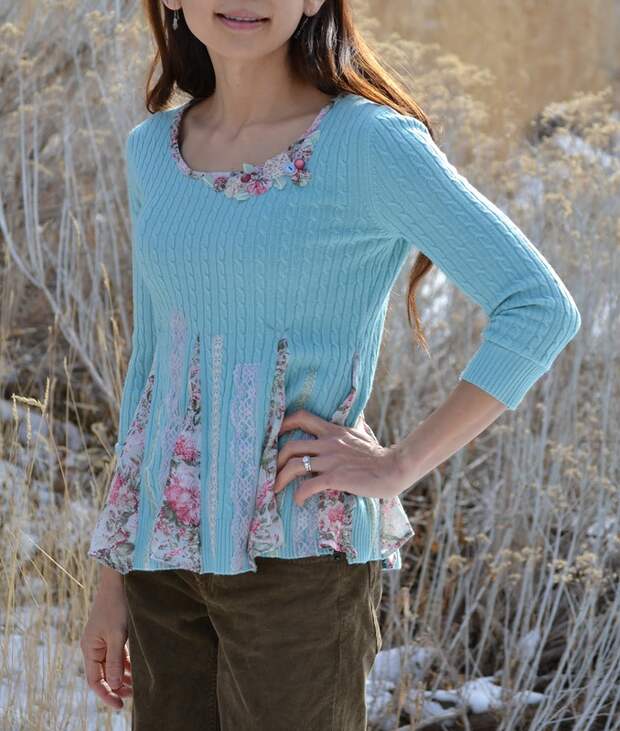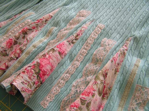 6.Декорируем свитер между вставками из ткани различными кружевами, лентами и тесьмой, подобранными по цвету в тон вставкам.