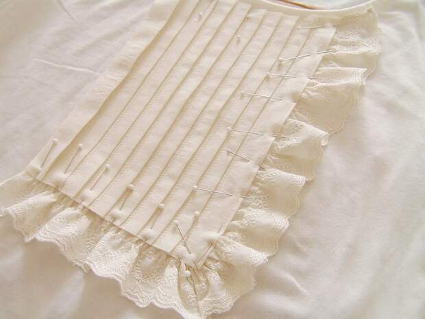3.Делаем оборку из шитья и пристрачиваем плиссированную деталь с оборкой на футболку, совмещая ее горловину с вырезанной выемкой на плиссерованной детали.