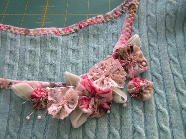 7.Украшаем ворот свитера цветами-розетками , сделанными из присобранного кружева, из присобранных кружочков ткани и бархатной тесьмы.