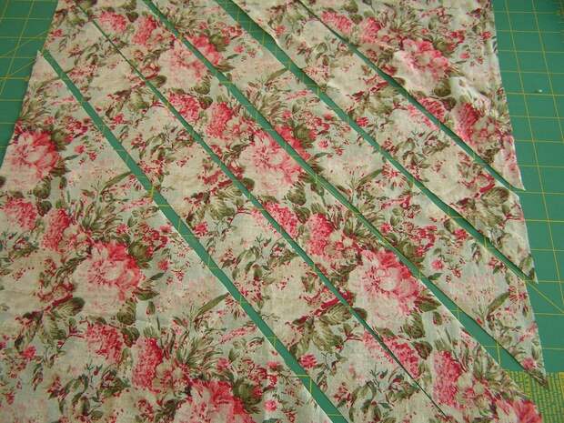 5.Вырезаем из ткани для вставок косую бейку шириной 4-5 см и окантовываем новую горловину этой бейкой , используя шов "зигзаг".