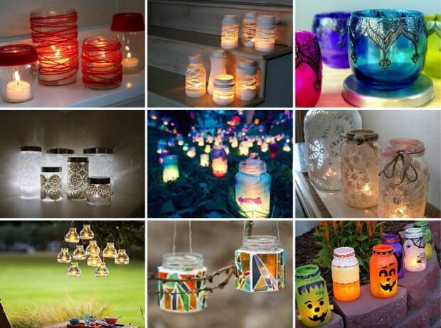 Желаете оригинально украсить светильники, тогда приступайте. Самый простой вариант - крепко обмотайте банки яркой пряжей и завяжите концы. Нитки можете приклеить, но сначала не забудьте удалить этикетки из стекла.